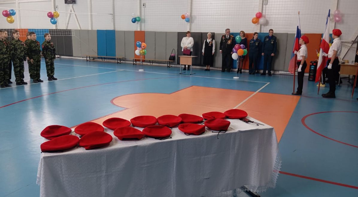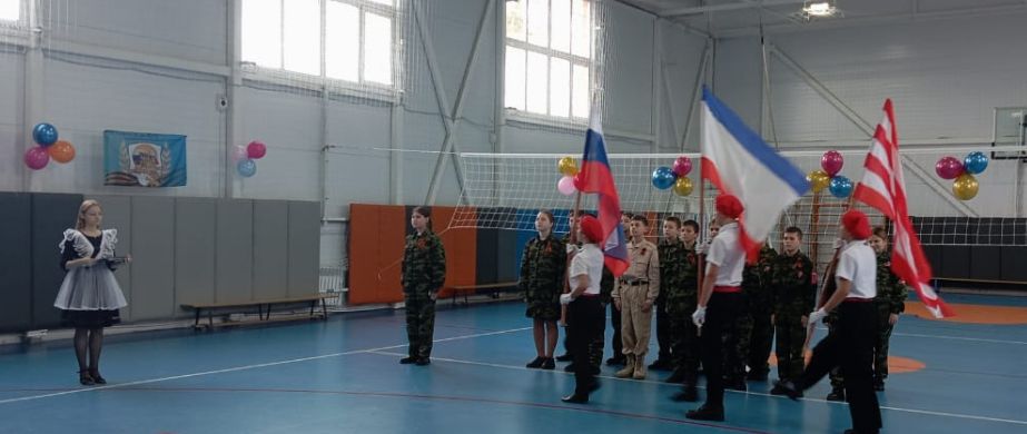 Все собрались в спортивном зале на торжественную линейку, чтобы поздравить вступающих в КАДЕТЫ. Под аплодисменты встретили будущих Кадетов, внесли флаги, был исполнен Гимн России.