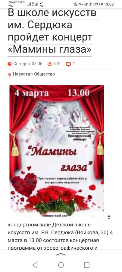 5 марта 2023 года В концертном зале Детской школы искусств им. Р.В. Сердюка состоялась концертная программа от хореографического и театрального отделения "Мамины глаза", посвященная Международному женскому дню.