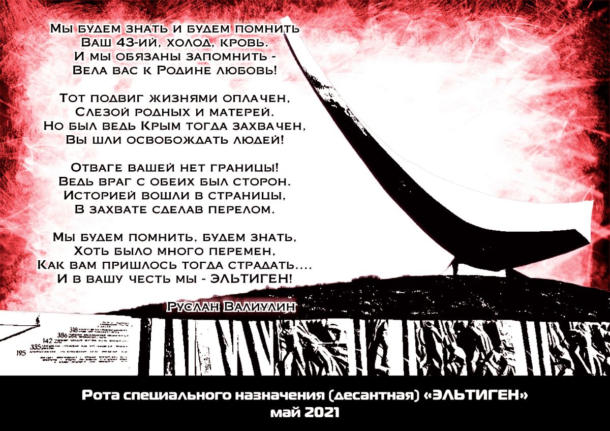 Небольшая рыбацкая деревня Эльтиген (тюрк. «наветренная сторона»), ныне мкр-н города-героя Керчи Героевское, стала известна в ноябре 1943 года всему Советскому Союзу. Подвиг советских десантников, ставший образцом беспримерного героизма и мужества, стал прологом к освобождению Крыма. Небольшой Эльтигенский плацдарм, захваченный в ночь на 1 ноября 1943 года и удерживаемый в течение 36 дней и ночей, вошёл в историю Великой Отечественной Войны под поэтическим названием «Огненная земля». И слова эти стали символом мужества и славы.