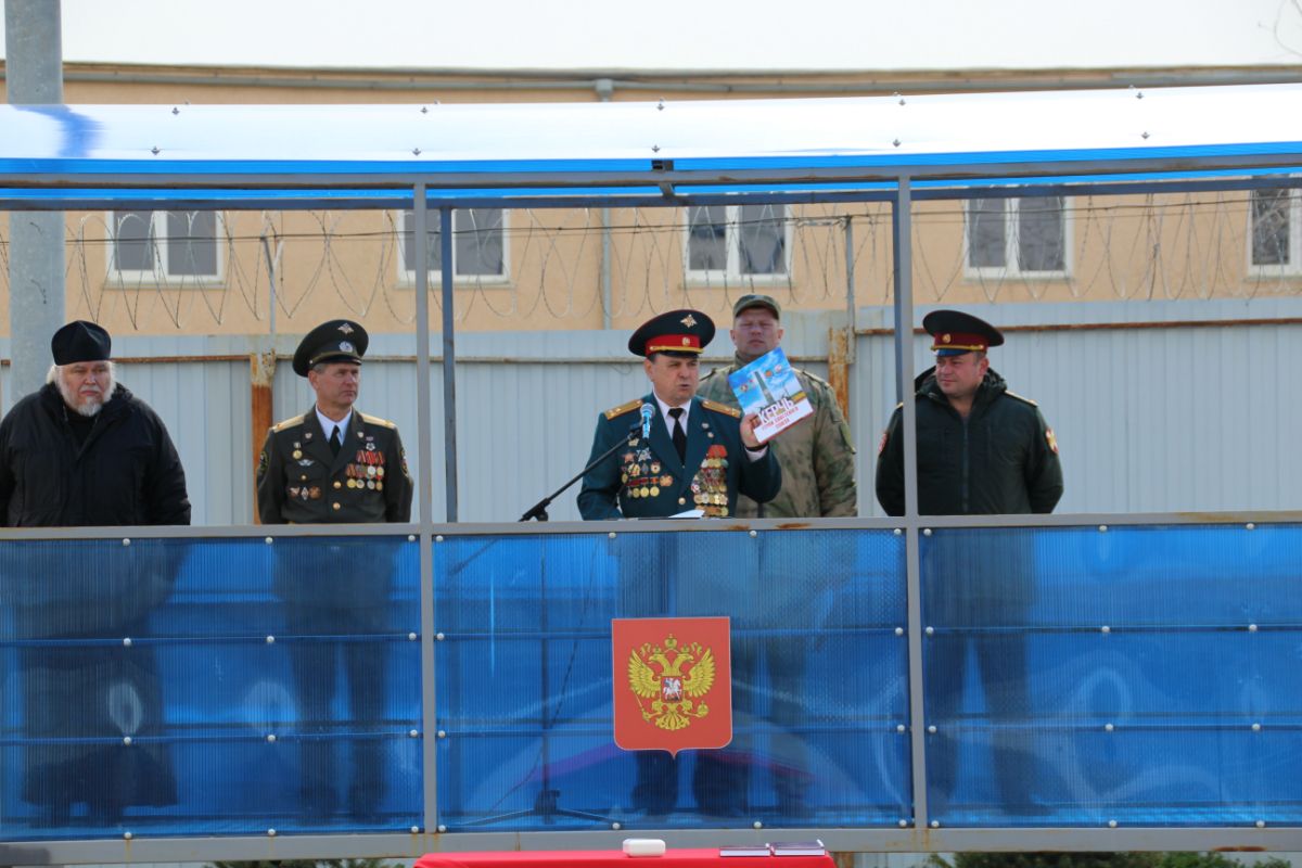 С поздравлением от ветеранов выступил заместитель председателя Комитета ветеранов Савченко Игорь Анатольевич. Он поздравил военнослужащих со знаменательным днём, пожелал здоровья, успехов в службе, благополучия семьям военнослужащих и вручил памятную книгу городского Совета ветеранов «Керчь. Герои Советского Союза».