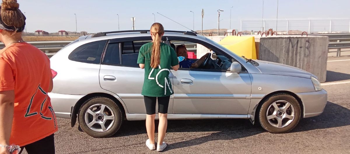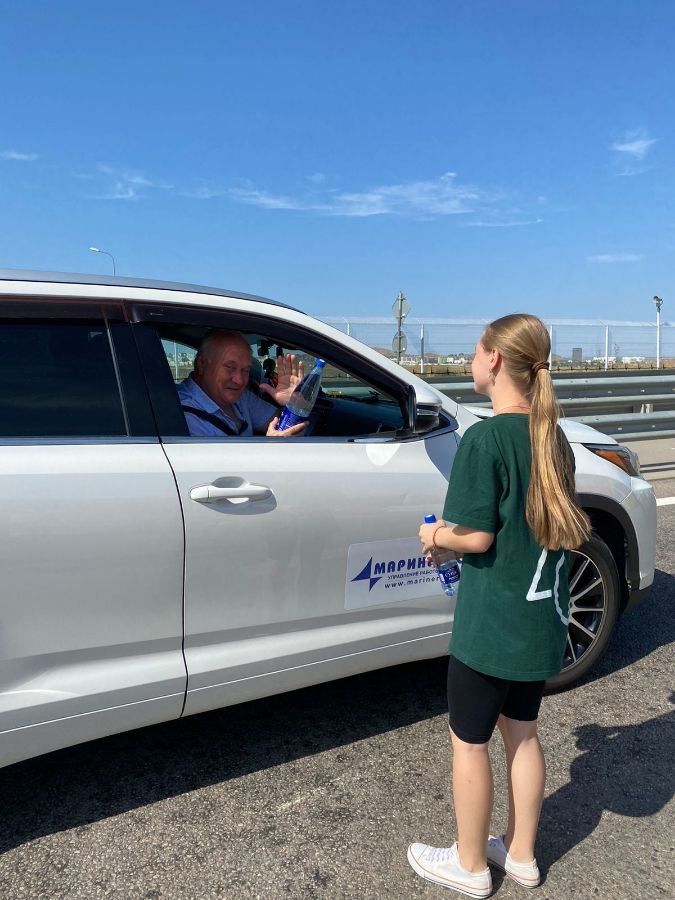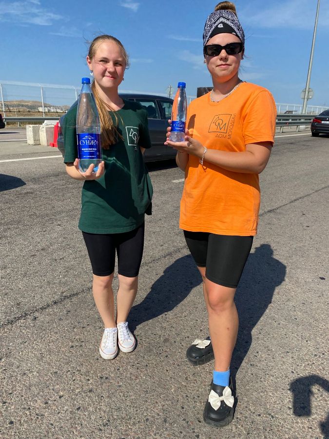 А именно их дочери Пшеничникова Наталия и Скуратова Алёна раздают воду туристам на автоподходах к Крымскому Мосту!