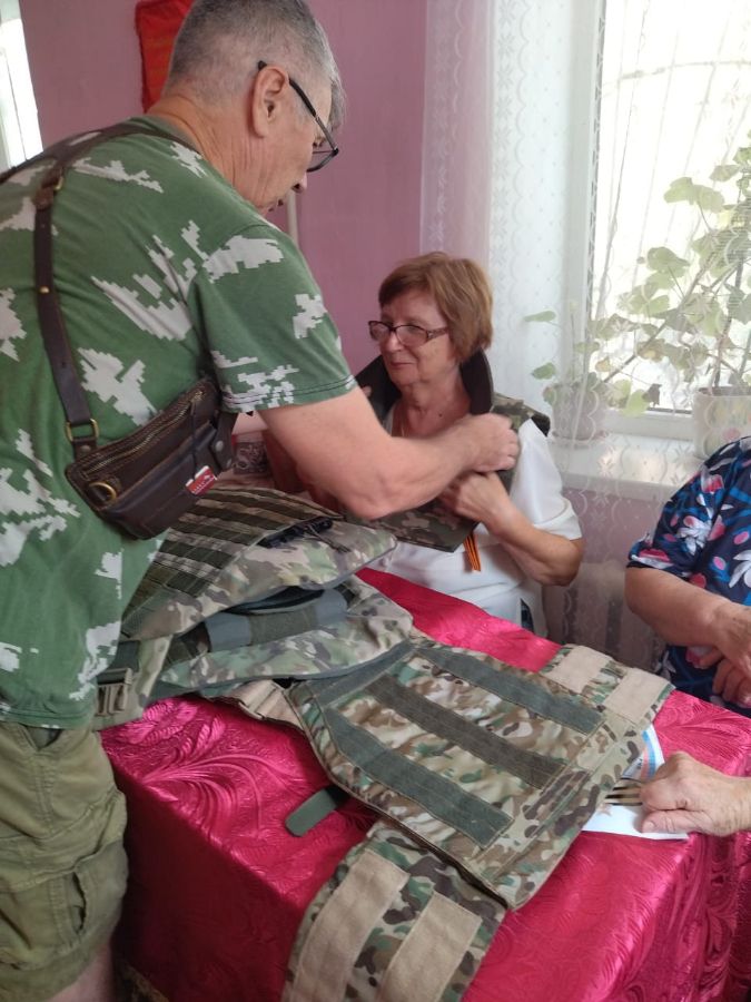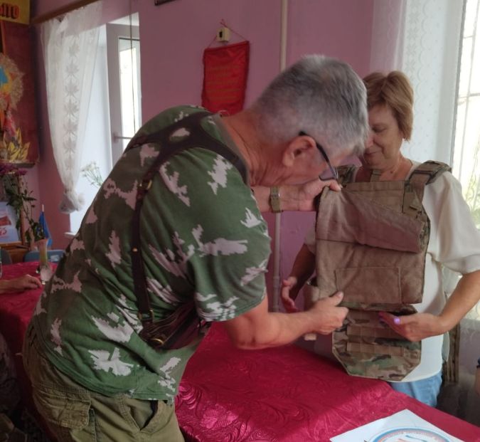 Тисленко Олег Владимирович - волонтер. Его волонтерская работа включает большой спектр дел и услуг. Он занимается доставкой сшитого своими руками снаряжения и гуманитарной помощи, для нуждающихся во все районы военных действий и госпиталей. Присутсвующие примерили Образцы амуниции и дали высокую оценку их качеству.
