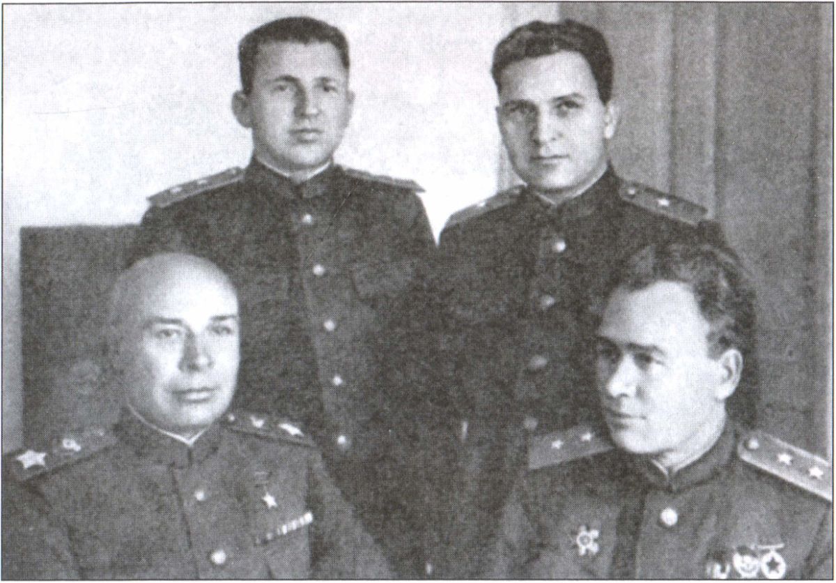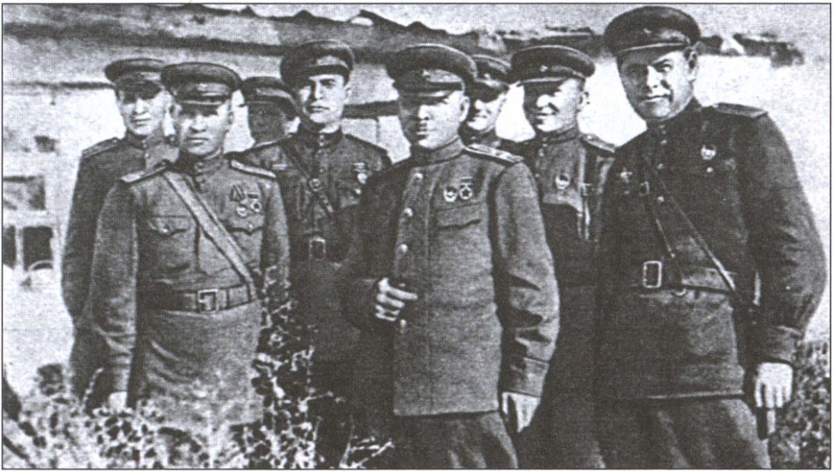Командование 318-й стрелковой дивизии перед высадкой. В первом ряду (слева направо) начальник штаба полковник П.Ф. Бушин, полковник комдив В.Ф. Гладков, замполит подполковник Г.И. Павлов