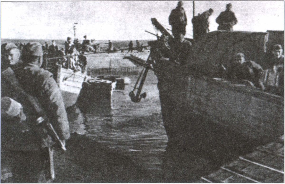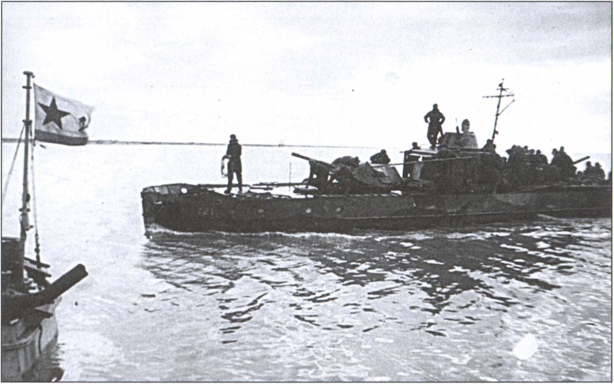 Бот ПВО-11 (еще на Волге). Эти боты, созданные на базе проекта 165, в ходе операции использовались как десантные транспорты и высадочные средства, а также для эскорта обычных десантных ботов при прорывах в Эльтиген. Благодаря мощному вооружению (37-мм автомат 70 К, а также пулемет ДШК или 20-мм «Эрликон») могли убедительно постоять за себя