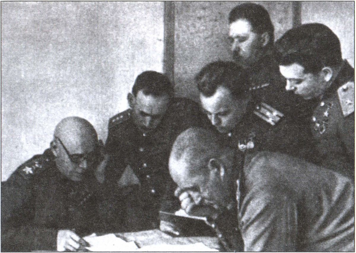 Обсуждение плана высадки в районе Эльтигена, октябрь 1943 года. Крайний слева — представитель Ставки маршал С.К. Тимошенко, второй слева — командующий 18-й армией генерал-полковник К.И. Леселидзе, на переднем плане справа — командующий фронтом генерал армии И.Е. Петров